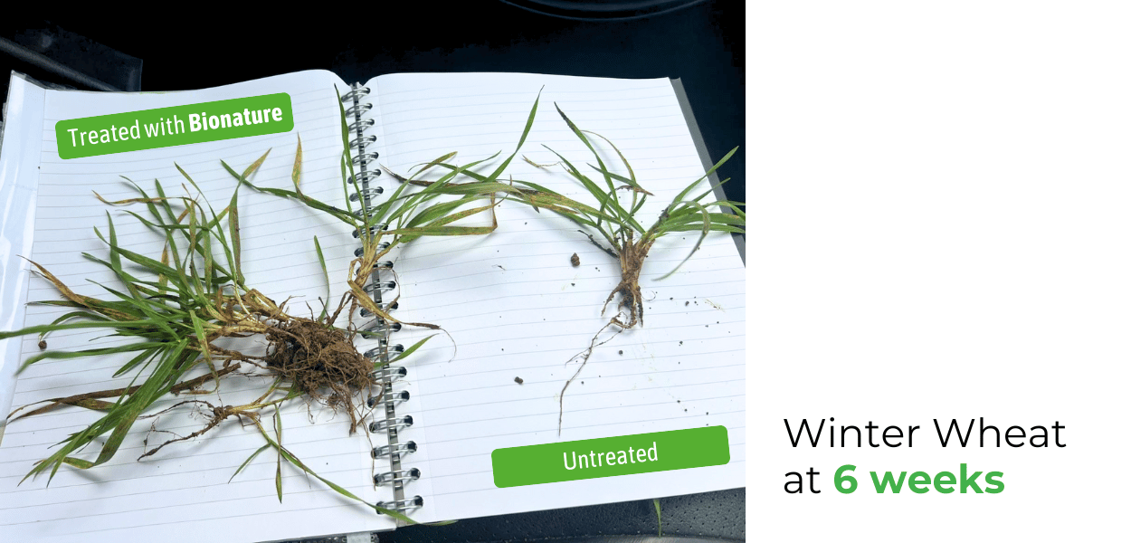 Six weeks after application, the impact of Bionature treatments on winter wheat is clear and measurable. Comparing treated plants to untreated ones reveals a striking difference in both root development and overall plant vigour.